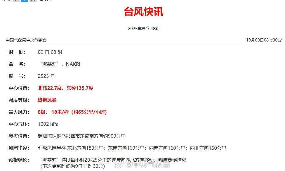 另外,台风“娜基莉”今天8时位于距离琉球群岛那霸市东偏南方向约900公里的洋面上,中心附近最大风力8级(18米/秒,热带风暴级)。