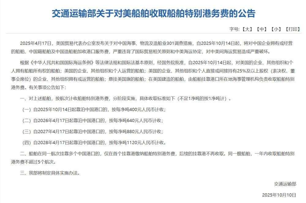 根据《中华人民共和国国际海运条例》等法律法规和国际法基本原则,经国务院批准,自2025年10月14日起,对美国的企业、其他组织和个人拥有船舶所有权的船舶;美国的企业、其他组织和个人运营的船舶;美国的企业、其他组织和个人直接或间接持有25%及以上股权(表决权、董事会席位)的企业、其他组织拥有或运营的船舶;悬挂美国旗的船舶;在美国建造的船舶,由船舶挂靠港口所在地海事管理机构负责收取船舶特别港务费。有关事项公告如下: