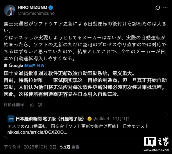 特斯拉董事会前成员Hiro Mizuno在社交媒体平台X上发表评论,认为国土交通省的决定意义重大,将为FSD等高级驾驶辅助功能在日本特斯拉用户中的推广扫清障碍。他表示,如果未来真正实现自动驾驶,每次软件更新都需重复审批流程,将难以跟上技术发展节奏。因此,这项决策将有助于所有汽车制造商在日本更便捷地引入自动驾驶技术。