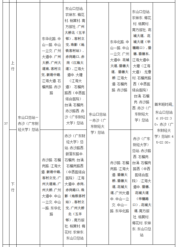 公共汽车37路由行经广州大桥、广州大道南、客村立交、新港中路等路段调整为行经花城大道、猎德大道、猎德大桥等路段,发班间隔调整为高峰期不大于10分钟一班,平峰期不大于15分钟一班,