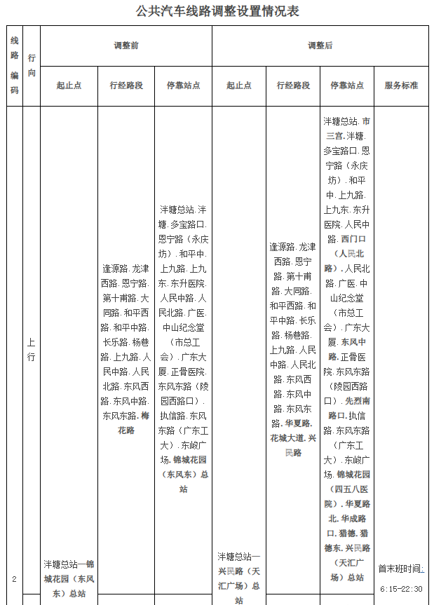 公共汽车2路由泮塘总站至锦城花园(东风东)总站调整为泮塘总站至兴民路(天汇广场)总站,