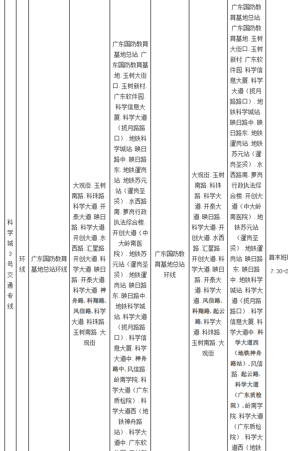 公共汽车科学城3号交通专线由行经神舟路、科翔路、风信路等路段调整为行经风信路、科翔路、起云路等路段,