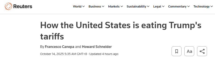 路透社网站报道截图。哈佛大学教授阿尔贝托·卡瓦洛和研究人员的追踪发现,自美国政府3月初开始征收关税以来,进口商品价格上涨了4%,而其国内产品的价格上涨了2%。