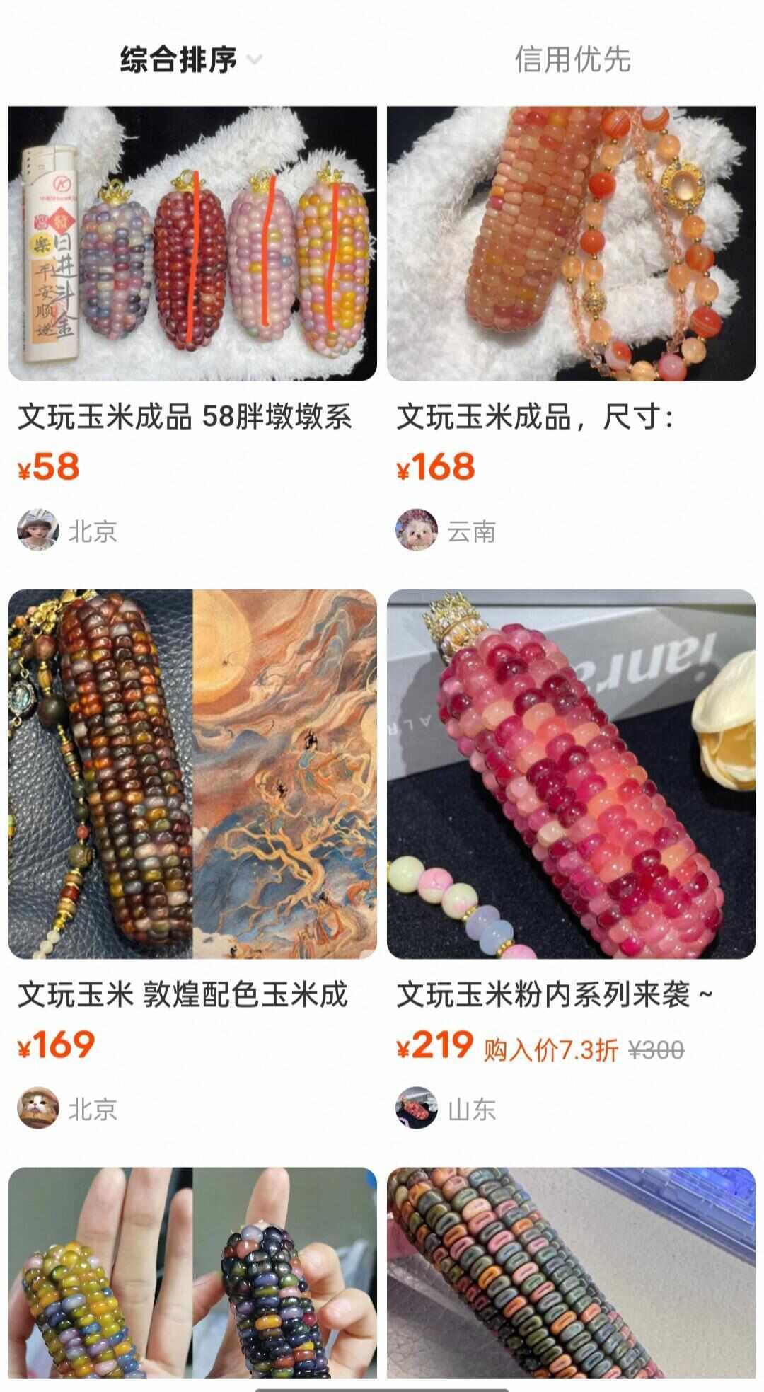 线上渠道更显热闹:淘宝上从基础手把件到搭配珍珠的“高定款”应有尽有;闲鱼平台除成品外,还充斥着毛料、定制加工服务,部分极品玉米标价甚至突破上万元。