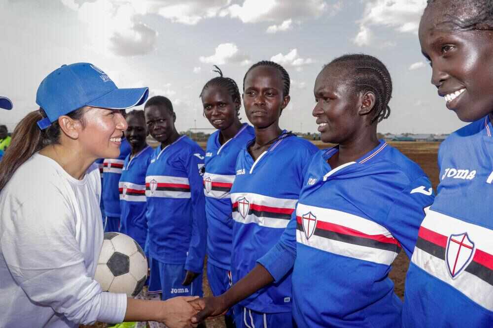 2024年2月21日,联合国难民署亲善大使、奥运冠军杨扬(左前)与卡库马难民营女子足球队队员交流。新华社发(联合国难民署供图)