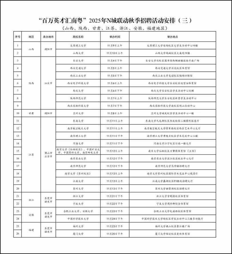 “百万英才汇南粤”2025年N城联动秋季招聘活动正火热进行中。活动围绕“粤聚英才、粤见未来”主题,由广东省委、省政府联合教育部主办,广东省委人才办、省人力资源社会保障厅、省教育厅,广东省21个地级以上市党委、政府,广东省委横琴工委、广东省政府横琴办承办。