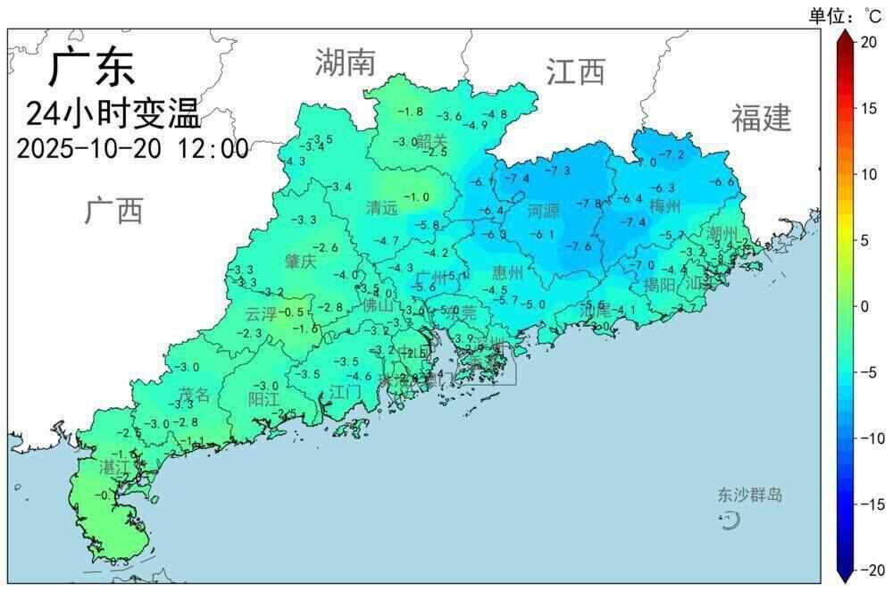 根据广东省气象部门监测,19日白天,韶关、清远、肇庆、云浮、河源北部最高气温较18日下降了4~7℃,其余市县下降了1~4℃。20日早晨,除梅州南部和粤东市县最低气温较19日上升了1℃左右,其余市县下降了2~4℃。其中河源、韶关和云浮、肇庆、清远三市的北部介于17~21℃,梅州南部、粤东、珠三角南部和雷州半岛南部市县介于23~27℃,其余大部分市县介于21~23℃,清远连山录得全省最低气温17.4℃。另外,粤北山区、珠三角、南部沿海市县已出现5~7级阵风。截至20日12时,包括梅州南部、粤东市县在内的广东所有国家基本气象站,均处于24小时同比降温状态。