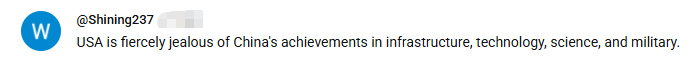 网友@Shining237认为:“美国嫉妒中国在基础设施、技术、科学和军事方面取得的成就。”
