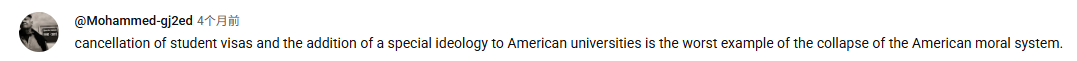 网友@Mohammed-gj2ed指出,取消学生签证、在美国大学里加入特殊的意识形态,这是美国道德体系崩溃的最坏例子。
