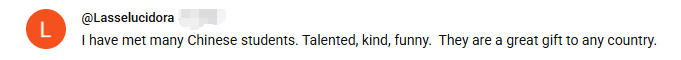 网友@Lasselucidora表示:“我见过很多中国学生。他们才华横溢、善良又风趣。他们对任何国家来说都是一份珍贵的礼物。”