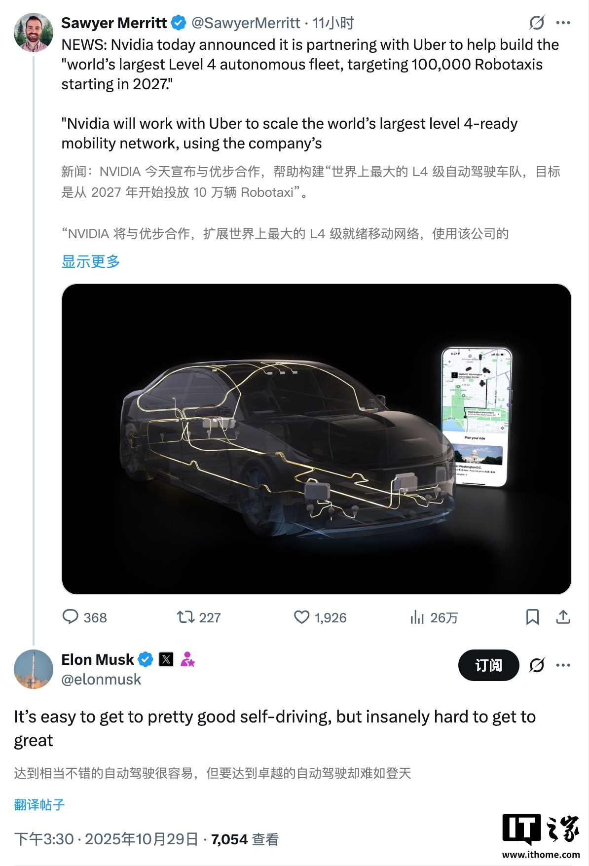 今日,马斯克对英伟达与优步合作共建世界最大规模L4自动驾驶车队的新闻做出回应,他认为自动驾驶技术达到“相当不错”的水平很容易,但要达到“卓越”的水平则相当困难。英伟达宣布与优步合作,共同打造全球最大规模的L4自动驾驶出行网络。这一合作将依托优步的下一代Robotaxi及自动配送车队,配合英伟达的Drive AGX Hyperion 10自动驾驶开发平台和专为L4自动驾驶设计的英伟达Drive软件。