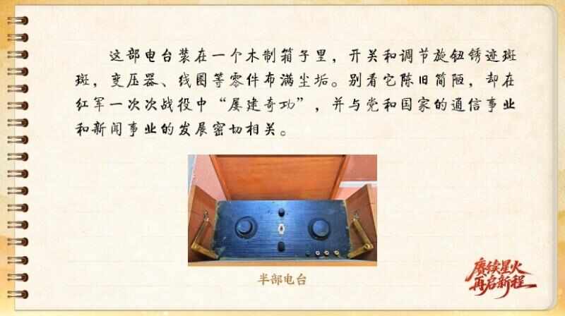 它为什么叫“半部电台”?1930年12月30日,红一方面军在第一次反“围剿”的龙冈战斗中,缴获了敌师部中一部灯座为弹簧式的15瓦无线电台。但电台的发报机已坏,收报机和充电机则完好无损。也就是说,这部电台充其量只能算“半部”。但在当时,对红军部队来说,“半部电台”也极其珍贵!