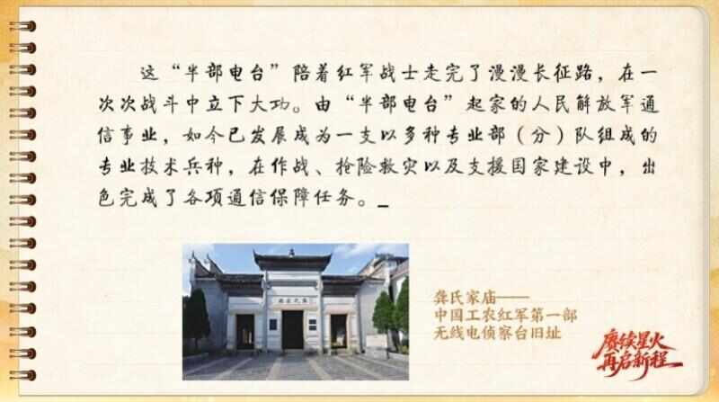 这“半部电台”陪着红军战士走完了漫漫长征路,在一次次战斗中立下大功。由“半部电台”起家的人民解放军通信事业,如今已发展成为一支以多种专业部(分)队组成的专业技术兵种,在作战、抢险救灾以及支援国家建设中,出色完成了各项通信保障任务。