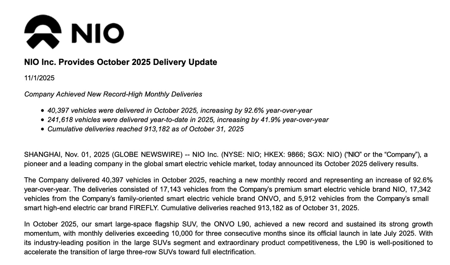 今日,蔚来汽车公布了2025年10月的销量成绩单,创下了公司历史上的最佳月度纪录。10月份,蔚来汽车共交付了40397辆汽车,同比增长92.6%。这一成绩包括蔚来主品牌交付的17143辆汽车、乐道品牌的17342辆汽车,以及萤火虫品牌的5912辆汽车。截至10月31日,蔚来品牌的累计交付量达到了913,182辆。