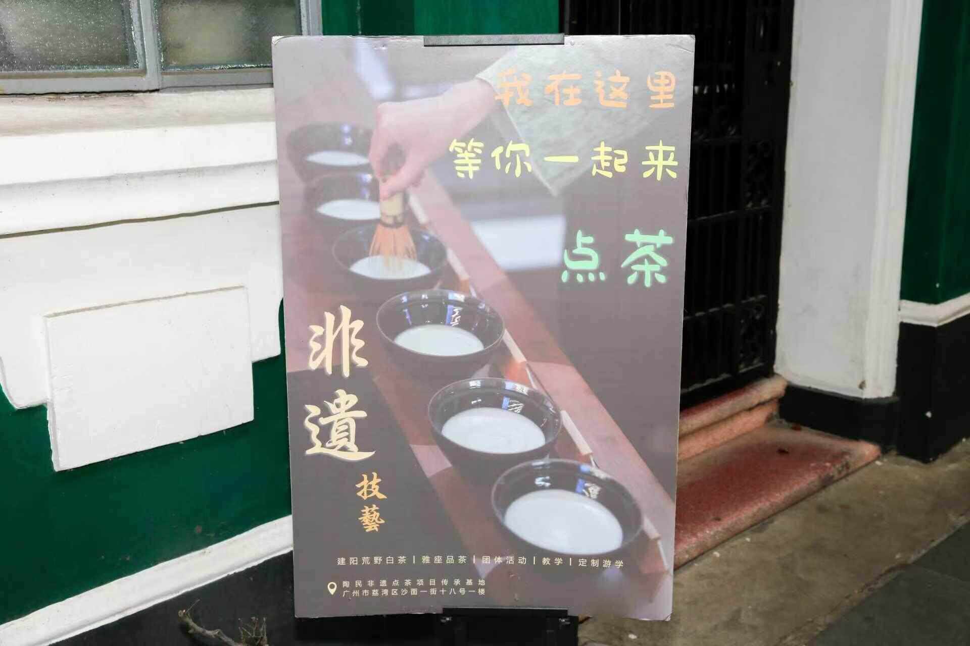陶民非遗点茶传承基地位于沙面一街18号首层(全国重点文物保护单位沙面一街印度人住宅旧址)。在这里,能体验中国宋朝风雅至极的“点茶”技艺。