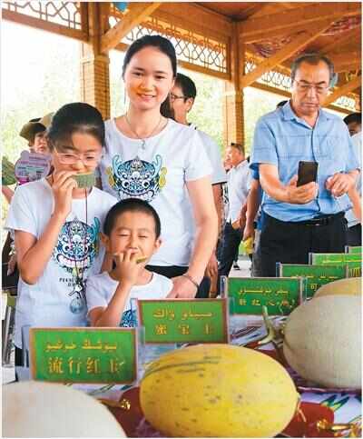 游客在哈密瓜节上品尝哈密瓜。