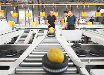 哈密市伊州区花园乡哈密瓜分选中心智能分选设备正在运行。