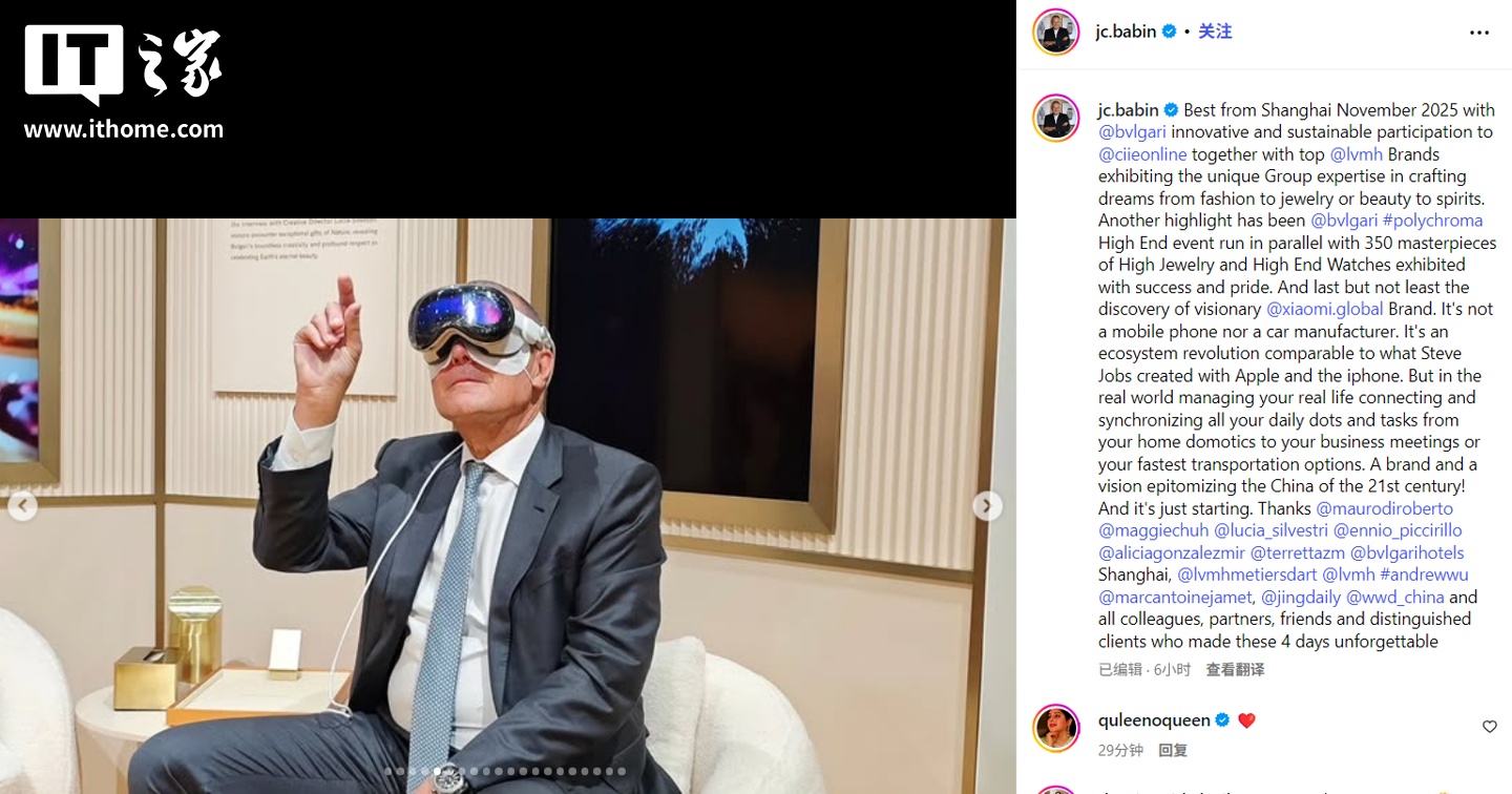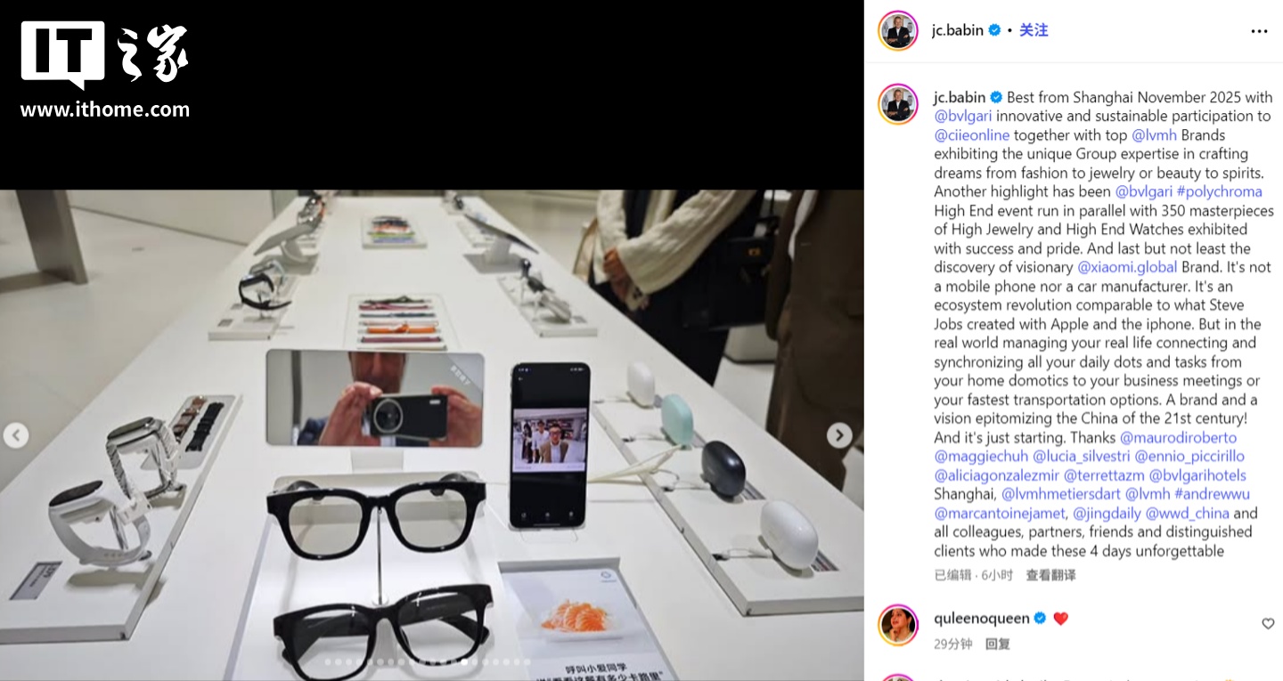 巴宾在上海进博会上体验了小米汽车,并参观了小米的多种生态产品。他还晒出了自己体验XR头显的照片,展示了小米在科技领域的多元化发展。宝格丽作为意大利奢侈品牌,自2011年起归属法国LVMH集团,巴宾的这一评价显示了小米在全球范围内的影响力和认可度。