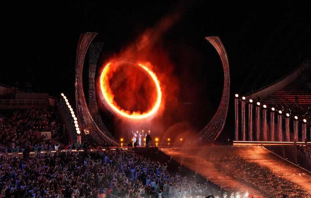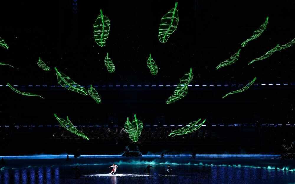 节奏忽转明快,足球、篮球、排球、骑行等体育元素跃然台上。歌曲《龙腾伶仃洋》将气氛推向高潮。奔跑的飞人与跃动的激光竞速,水上健儿在波涛中冲刺,展现科技与体育的融合。