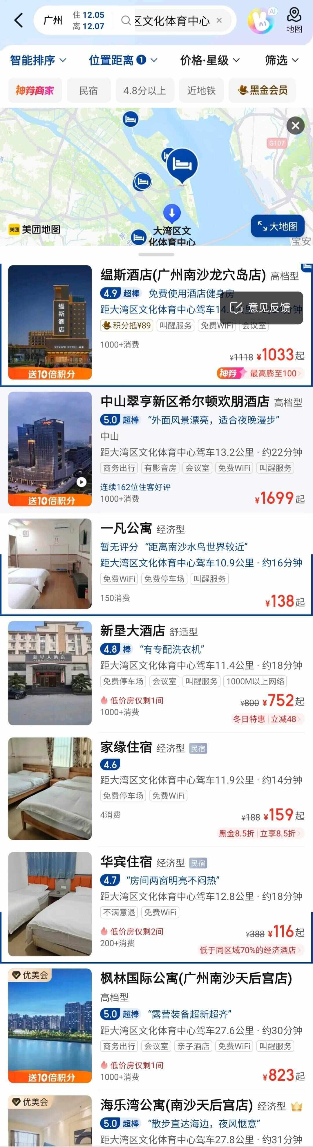 由于场馆距离广州市区较远,记者查询美团平台发现,场馆附近的多家酒店已经大幅涨价。以临近深中通道的中山市翠亨新区为例,位于翠亨新区的希尔顿欢朋酒店在12月5日至15日的两个周末价格已经涨至每晚最低1698元,而该酒店平日价格在400元左右,涨幅超4倍。