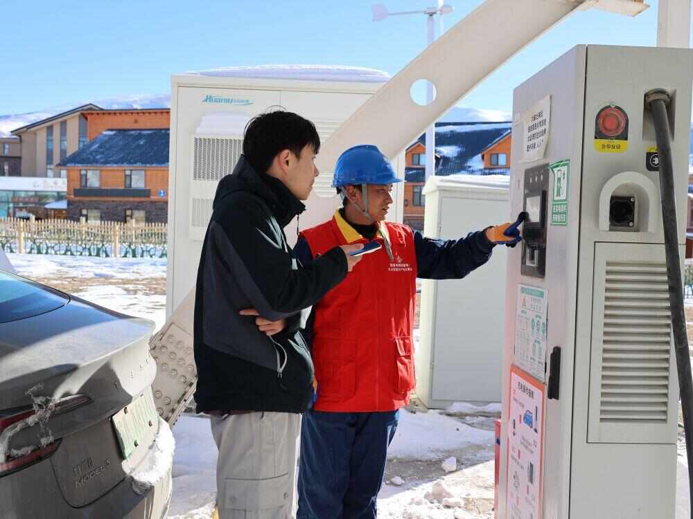 国网博尔塔拉供电公司工作人员为电车自驾游客讲解充电安全知识。(奥吾东 摄)