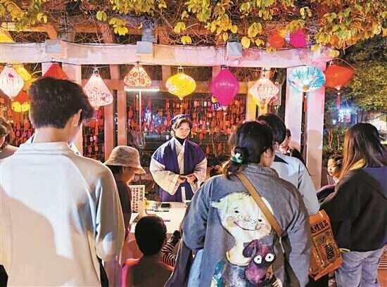 据清代《波罗外纪》记载,每年南海神庙波罗诞庙会期间“楼船花艇小舟大舸,连泊十余里……灯火通宵,登舻而望,真天宫海市不过是矣”。南海神庙的“复现·天宫海市”主题夜游项目,让这段历史从展厅走入历史空间,在夜幕下被再度点亮。项目以文献为基,融合剧本游、展演、灯光等形式,再现古时盛景。游客不仅可在“天宫市集”欣赏主题灯光与非遗摊位,还可化身“商人”完成古代贸易。这些沉浸式体验与展览中的互动项目相映成趣,共同展现海丝文化的多元魅力与时代活力。