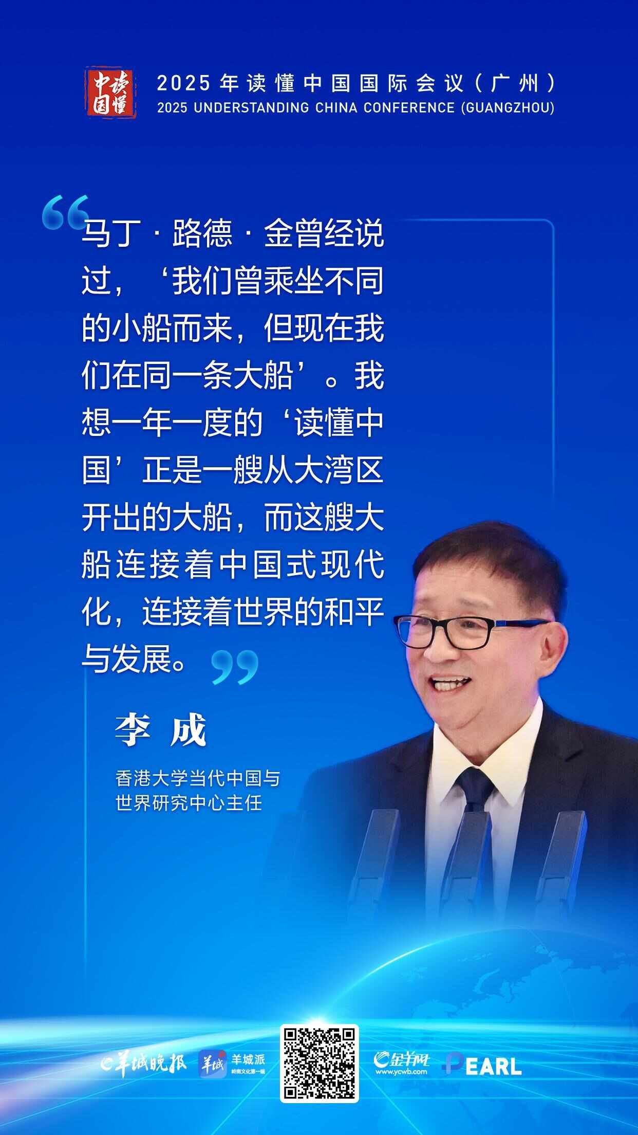 “马丁·路德·金曾经说过,‘我们曾乘坐不同的小船而来,但现在我们在同一条大船’。我想一年一度的‘读懂中国’正是一艘从大湾区开出的大船,而这艘大船连接着中国式现代化,连接着世界的和平与发展。“