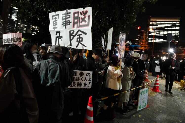 11月28日,民众在日本东京的首相官邸外参加针对日本首相高市早苗近期发表涉台错误言论的抗议活动。新华社记者贾浩成摄