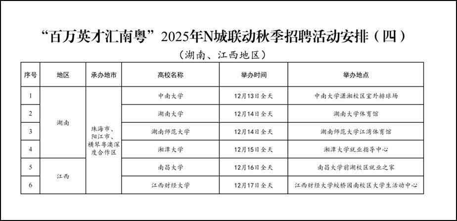 “百万英才汇南粤”2025年N城联动秋季招聘活动收官在即,切勿错过!近日,湖南、江西地区高校招聘安排正式对外发布。(如有调整将及时公布)