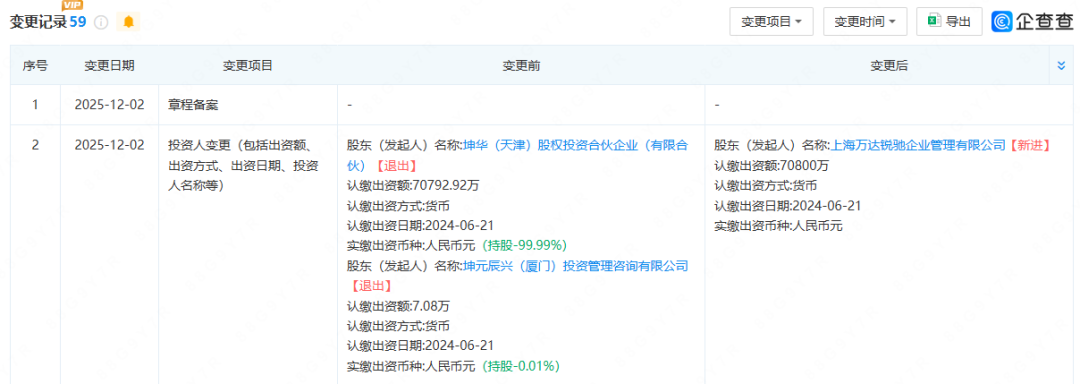 据界面新闻,企查查工商信息显示,12月2日,山东烟台芝罘万达广场有限公司发生工商变更,新华保险旗下坤华(天津)股权投资合伙企业(有限合伙)、坤元辰兴(厦门)投资管理咨询有限公司退出股东行列,新增万达商管旗下上海万达锐驰企业管理有限公司为全资控股股东,同时多位高管发生变更。