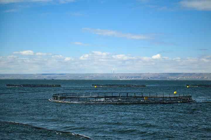 从空中俯瞰,龙羊峡水库平湖区的水面上,数个大大的圆圈整齐排开,这些都是三文鱼的养殖网箱。养殖网箱里,不时有鱼儿跃起。顺着管道,一条条三文鱼随着水流被吸鱼泵直接从养殖网箱吸入操作车间。
