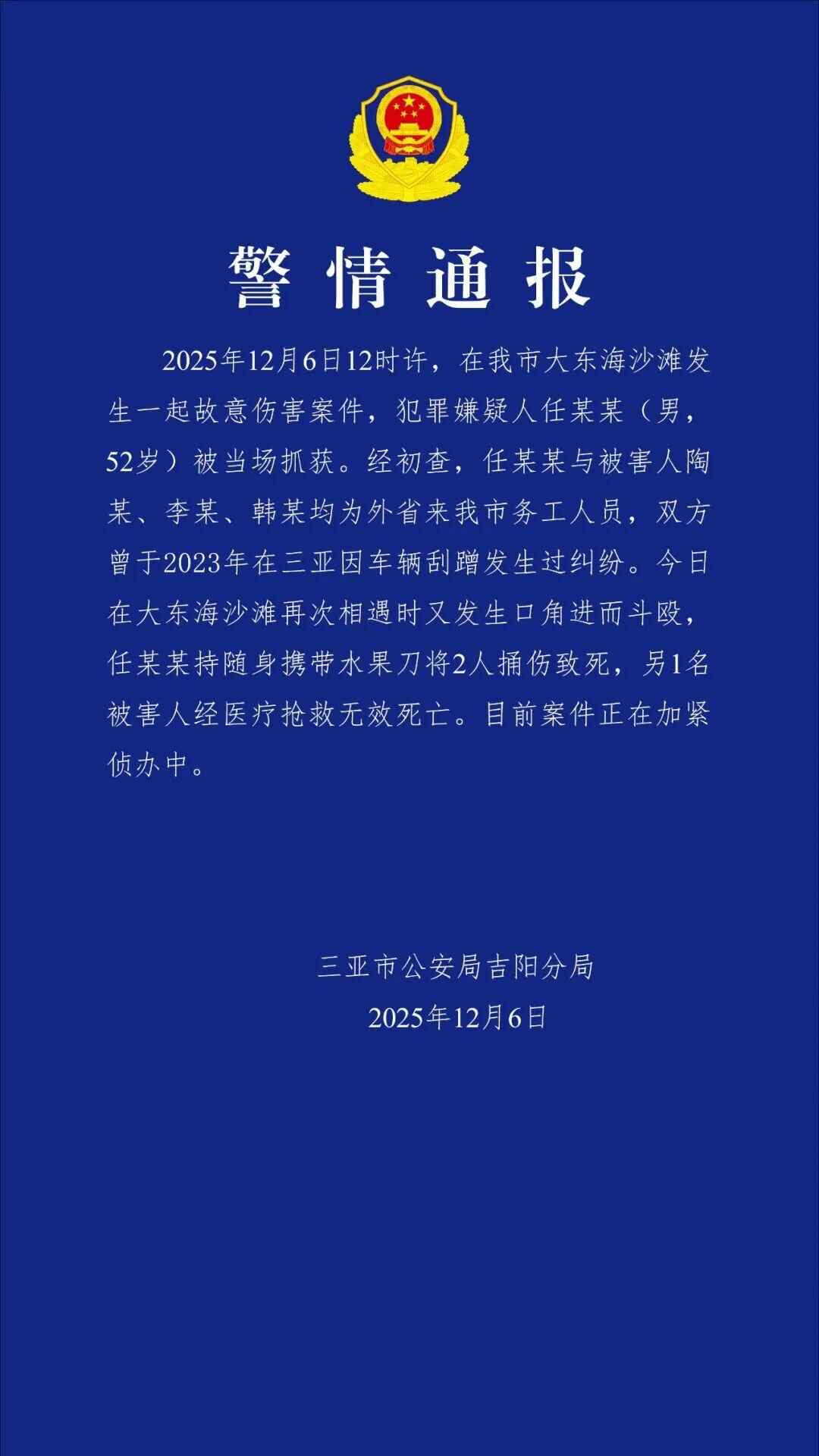 经初查,任某某与被害人陶某、李某、韩某均为外省来我市务工人员,双方曾于2023年在三亚因车辆刮蹭发生过纠纷。今日在大东海沙滩再次相遇时又发生口角进而斗殴,任某某持随身携带水果刀将2人捅伤致死,另1名被害人经医疗抢救无效死亡。