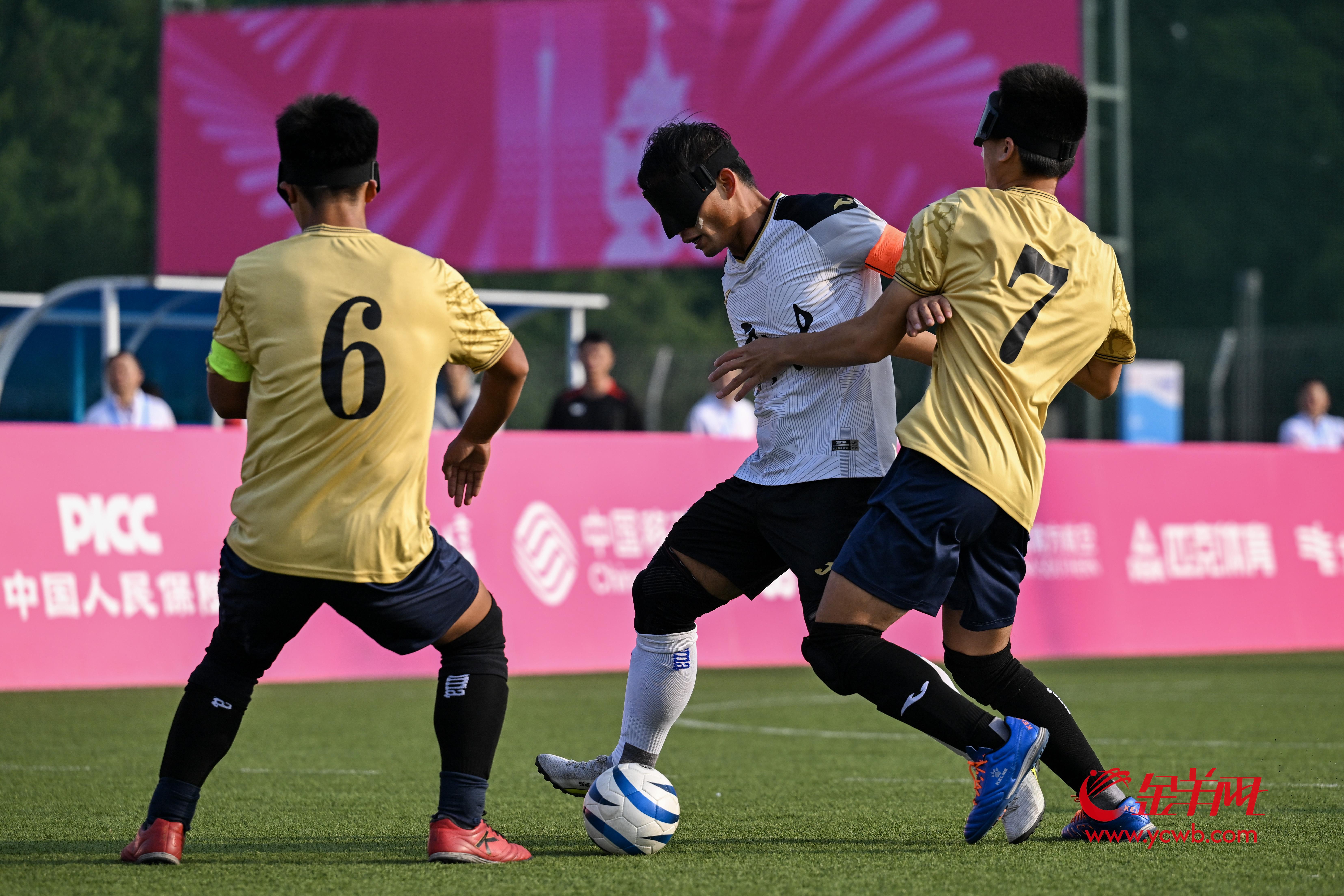 盲人足球的运动员上场前要带上特制的眼罩,在完全黑暗的世界里奔跑、传球、射门。