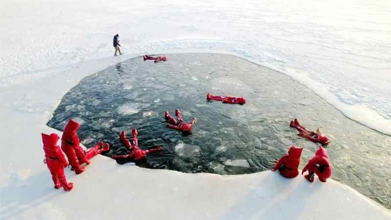 12月5日,在阿勒泰市阿苇滩镇,不少游客身着红色特制防寒服,在阿勒泰冰浮俱乐部体验冰浮项目。张福新摄