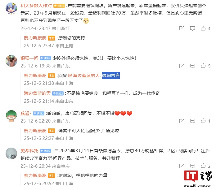 12月9日,赛力斯集团副总裁康波在微博上庆祝粉丝数突破40万,并在评论区与用户互动。用户询问MPV车型上市时间,康波以“相信相信的力量”暗示车型正在规划中。同时,有用户对问界M6车型提出建议,希望其造型追求经典,康波回应“借您吉言”。问界M6计划于明年二季度上市,主打25万元家用SUV市场,将提供增程版和纯电版。