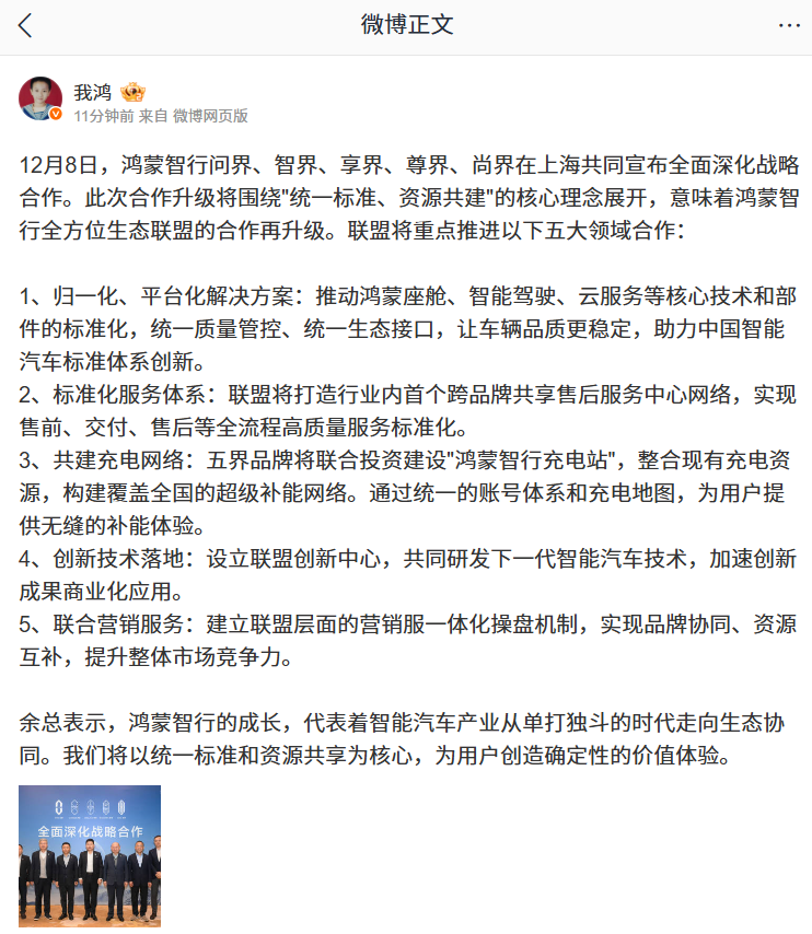 12月8日,鸿蒙智行在上海宣布与问界、智界、享界、尊界、尚界全面深化战略合作,旨在通过“统一标准、资源共建”的理念,推动全方位生态联盟的合作升级。此次合作将重点推进五大领域:归一化、平台化解决方案,标准化服务体系,共建充电网络,创新技术落地,以及联合营销服务。联盟将推动核心技术和部件的标准化,打造跨品牌共享售后服务中心网络,联合投资建设“鸿蒙智行充电站”,设立联盟创新中心共同研发智能汽车技术,并建立营销服一体化操盘机制。