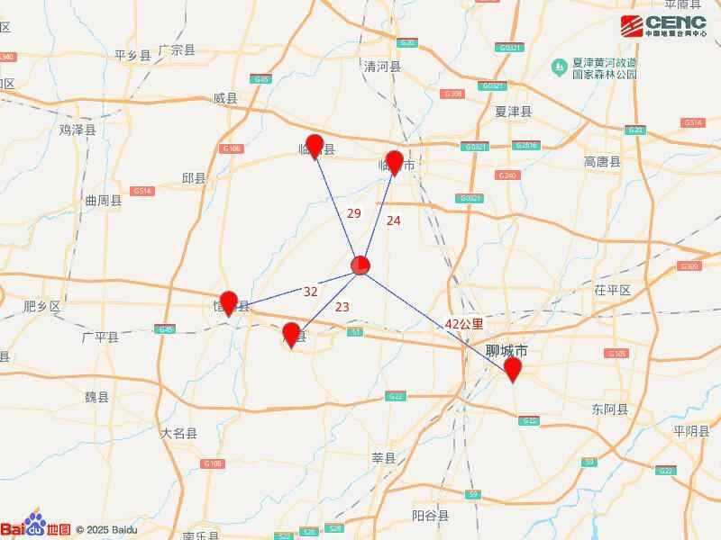 震中距冠县23公里、距临清市24公里、距河北临西县29公里、距河北馆陶县32公里、距东昌府区42公里,距聊城市38公里,距济南市125公里。
