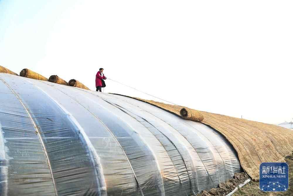 ↑ 12月11日,河南省济源市思礼镇农民为蔬菜大棚加盖保温草帘。新华社发(苗秋闹摄)
