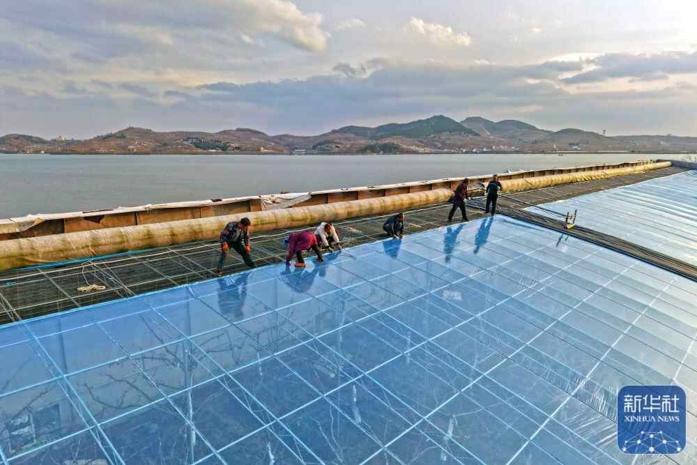 ↑ 12月11日,在山东省烟台市福山区张格庄镇,农民为樱桃大棚更换新的塑料薄膜(无人机照片)。新华社发(孙文潭摄)