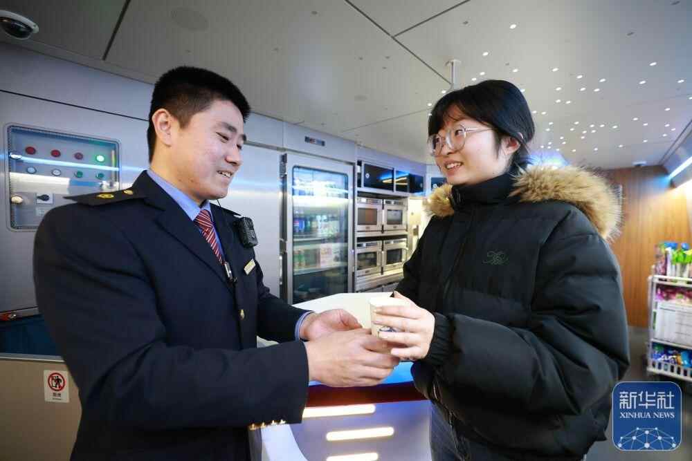 ↑ 12月11日,在哈尔滨西站,G904次列车工作人员为刚上车的旅客送上热茶。新华社发(徐率摄)