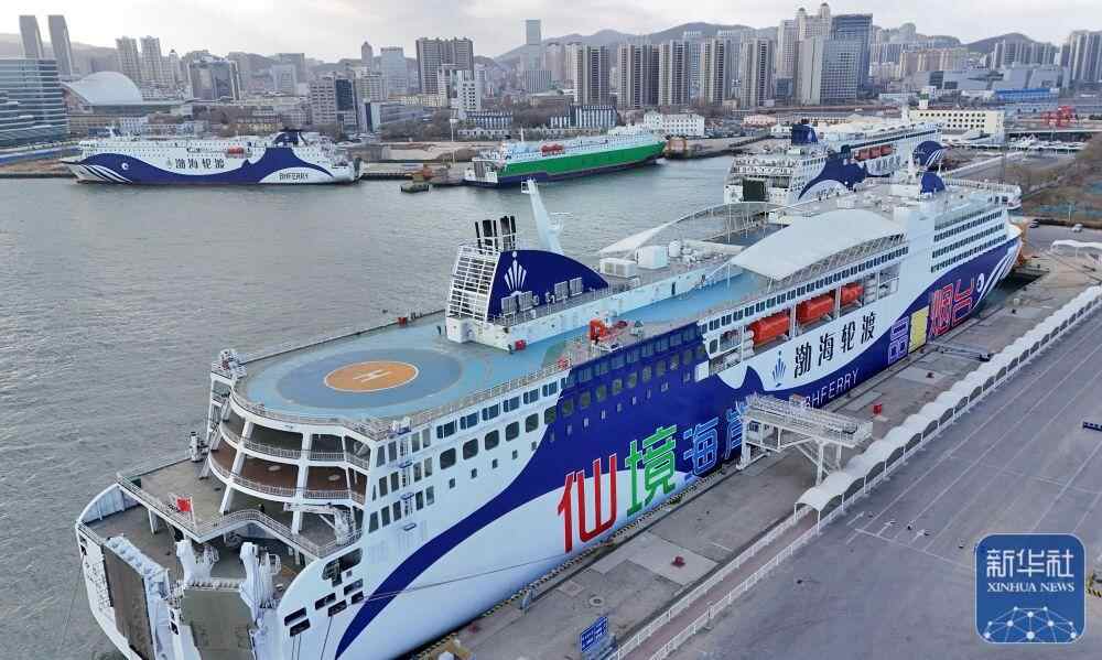 ↑ 12月11日,客轮在山东港口烟台港停靠避风(无人机照片)。新华社发(唐克摄)