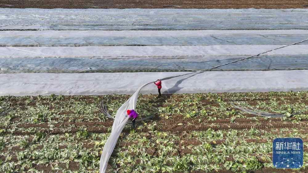 ↑ 12月11日,在山东省临沂市平邑县地方镇,村民为种植的蔬菜幼苗覆盖保温薄膜(无人机照片)。新华社发(武纪全摄)