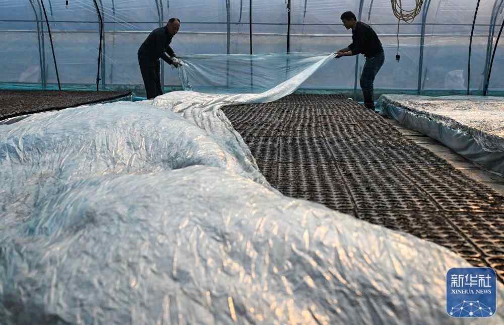 ↑ 12月11日,在河南省商丘市夏邑县会亭镇朱瓦房村大棚育苗基地,村民为刚刚下种的育苗苗床覆盖薄膜保温。新华社发(王高超摄)
