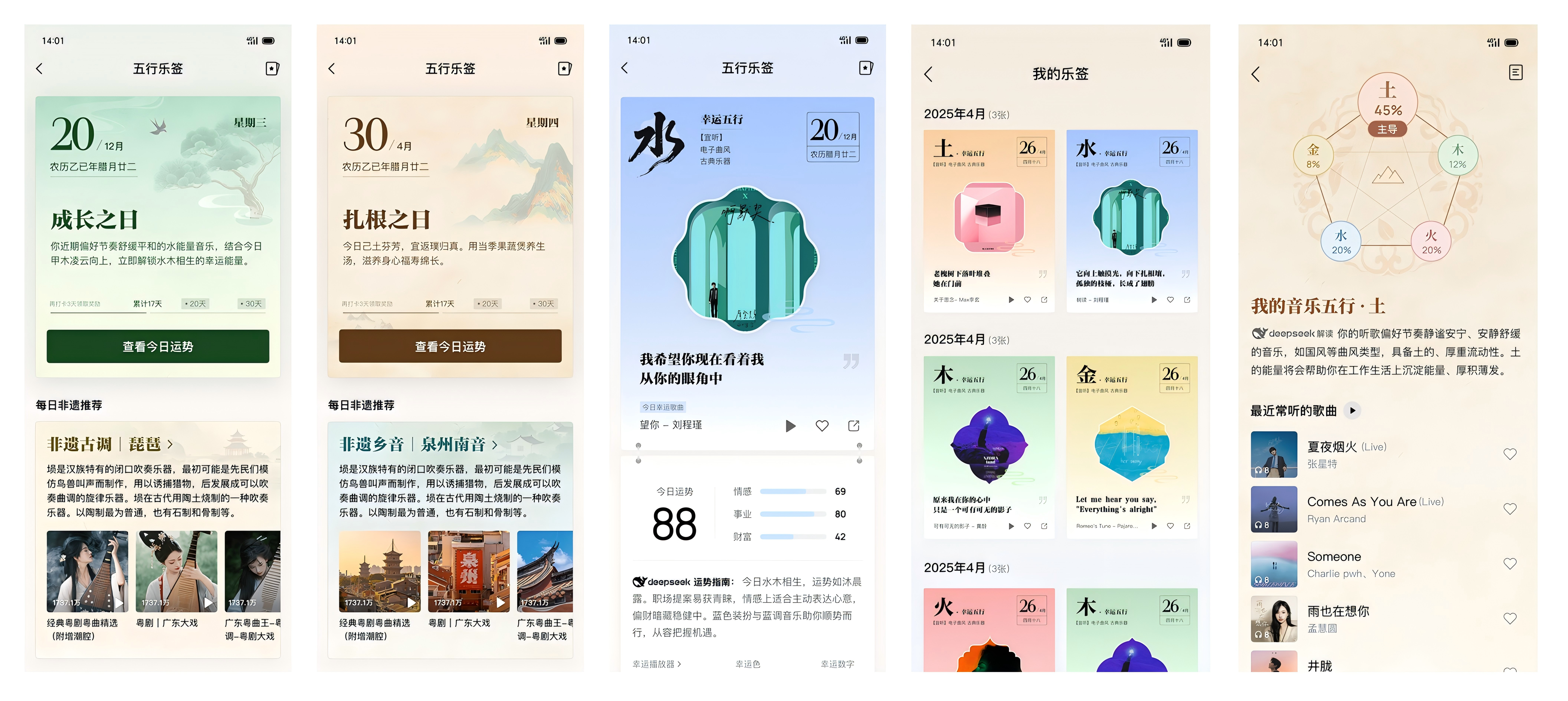 面向未来,Lillian指出酷狗的探索指向更深的共情与更广的连接。她以创新的“五行乐签”产品为例说明:“它融合了大语言模型对用户心理的感知、音频模型对音乐‘气质’的解析,以及中国‘金木水火土’的哲学体系,为用户生成包含专属诗词、图案与‘音乐处方’的视觉化乐签。这标志着我们的AI音乐推荐,正试图从‘信息匹配’迈向‘文化语境下的精准共情’。”