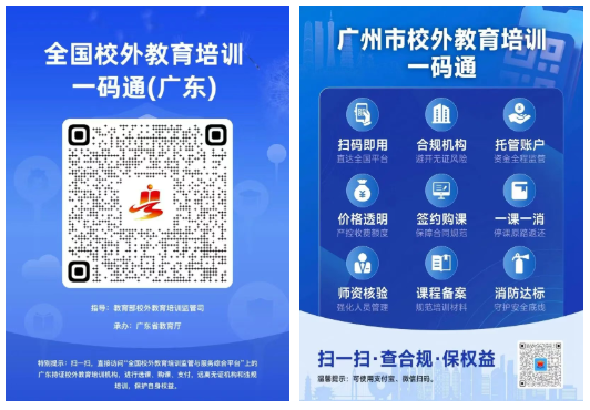 选课支付请使用“一码通”。“全国校外教育培训一码通”是依托全国校外教育培训监管与服务综合平台(简称“全国平台”)建设、覆盖广州市所有合规机构的官方二维码,家长学生可以通过支付宝、微信“扫一扫”功能,一键直达全国平台家长端,快速查询全国平台持证机构各类信息,“一站式”便捷开展在线选课、支付、合同签订、退费等校外教育培训服务。