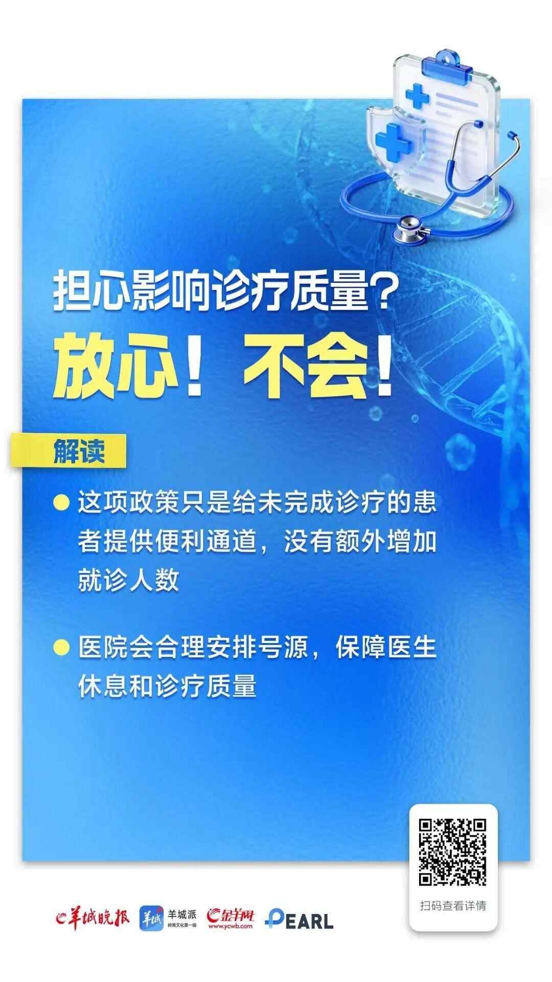 针对群众关心的“是否增加医生负担”“续诊能否优先就诊”等问题,广东省卫健委相关负责人表示,续诊患者原本就需要二次挂号就诊,政策并未额外增加就诊量;医疗机构将合理调配号源和人力资源,保障医务人员休息与诊疗质量。续诊患者需按预约时间报到候诊,一般与其他患者共同排队,具体流程以各机构公布为准。若因患者自身原因未按时续诊,续诊号将作废,再次就诊需重新缴费挂号。