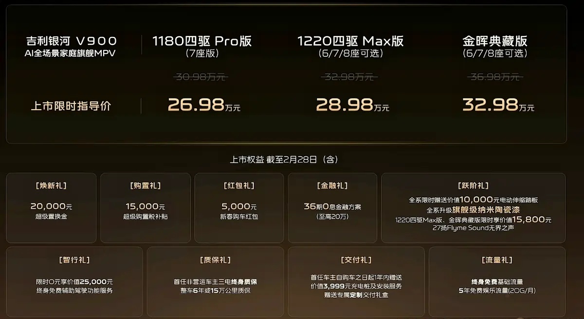 1月20日,吉利银河V900中大型MPV正式上市,官方售价30.98-36.98万元,限时指导售价26.98-32.98万元。新车共推出3款配置,前3000名用户可获得10克纯金礼遇。银河V900外观辨识度高,前脸有星河长虹灯和24K曜金车标,车身侧面线条平直,尾部为X型贯穿尾灯。车身尺寸5360/1998/1920mm,轴距3200mm。