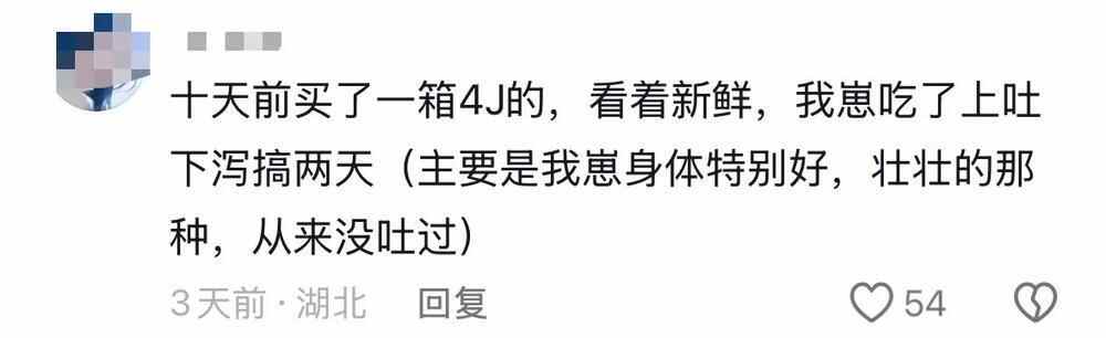 湖北一位宝妈反映,家里孩子吃了从超市买回的车厘子后,上吐下泻了两天。河南一位网友也表示,自己吃了三十几个车厘子后,晚上就急性扁桃体化脓发炎发烧 。更有甚者,有消费者吐槽自己买到了“陈年僵尸果”。有消费者表示,其于2月6日在某大型商超通过极速达团购了12箱车厘子,到手后发现大部分已发霉烂掉,“连清洗过的水都是变色的” 。