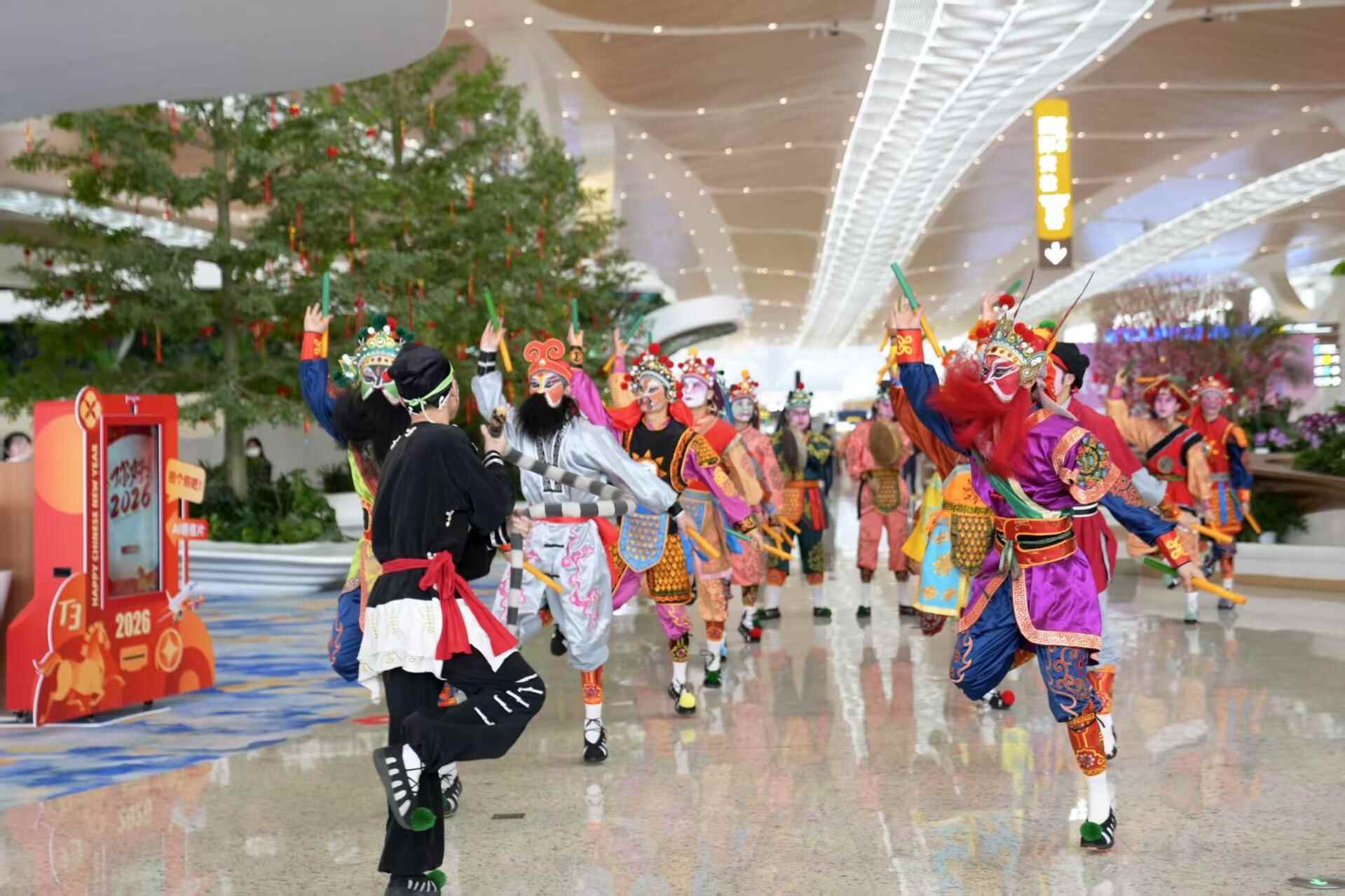这是大年二十八,正值春运返乡高峰,机场内不只聚集了踏上归途的游子,还有这群格外引人注目、穿着戏服、画着脸谱的英歌少年们。