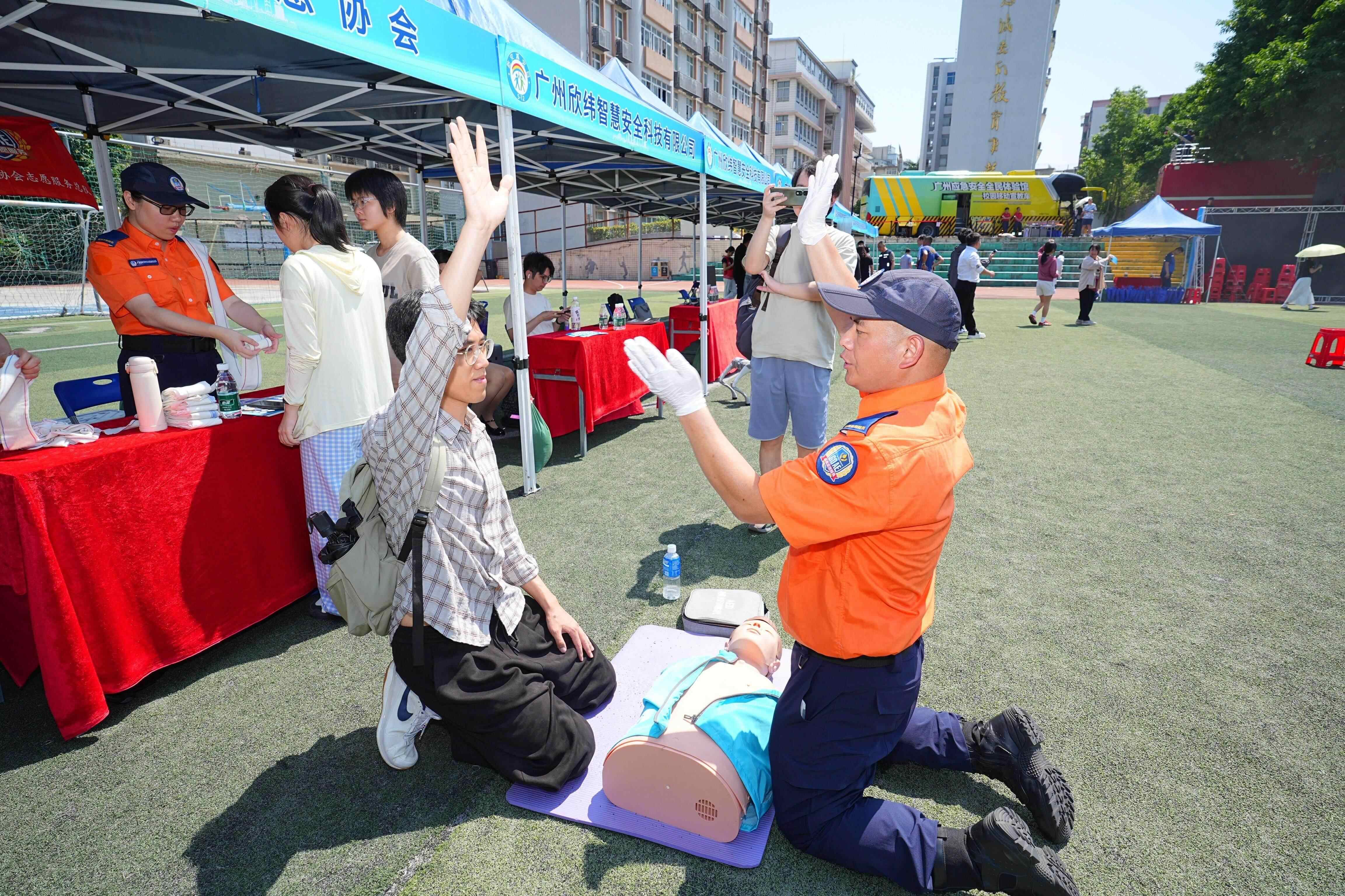 广东省应急协会志愿者服务总队,为师生讲解心肺复苏知识。